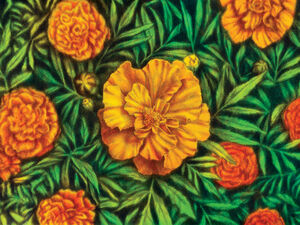 It was while working at Roganâs Our Farm in the Cartmel Valley, where the rhythms of the seasons are at their most apparent, that Hideyuki identified the inspiration for the Reflections artwork â the marigold flower. A plant close to Simonâs heart, the marigold is cherished not only for its great flavour and garnishing capabilities but also as a companion plant to help keep pests off other vegetables on the farm.
